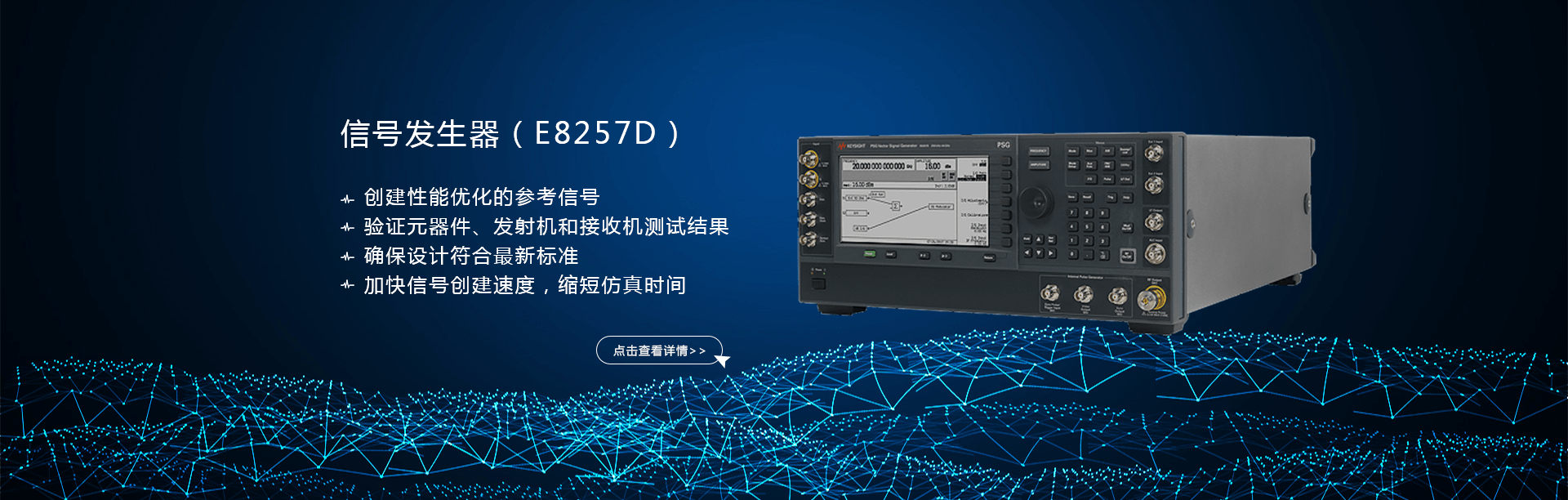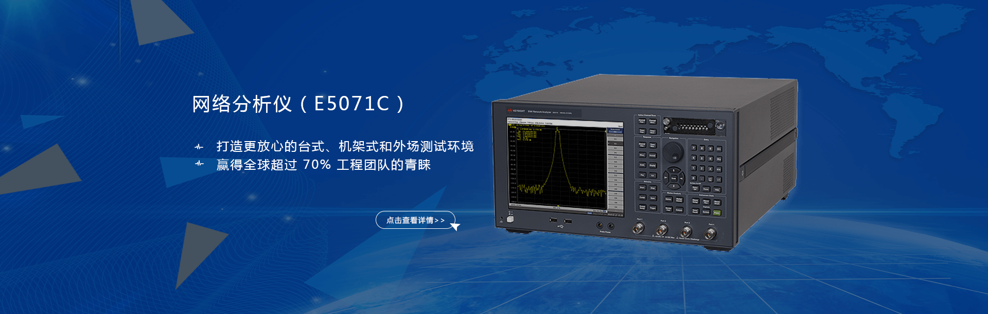 主要產品有:頻譜分析儀,網絡分析儀,綜合測試儀,藍牙wifi測試儀,噪聲系數測試儀,接收機,電話測試儀,高、低頻信號源,音、視頻信號分析儀,高精度萬用表, LCR/ 電橋、各種通信電源等。經營的儀器品牌主要有:Keysight/Agilent (惠普 / 安捷倫)、 R/S (羅德 & 施瓦茨)、 Anritsu (安立)、Litepoint、 FLUK( 福祿克 ) 、 TEK (泰克)等。